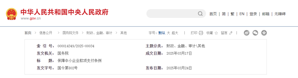 中华人民共和国国务院令 第802号 《保障中小企业款项支付条例》已经2024年10月18日国务院第43次常务会议修订通过,现予公布,自2025年6月1日起施行。 总理 李强 2025年3月17日 保障中小企业款项支付条例 (2020年7月5日中华人民共和国国务院令第728号公布 2025年3月17日中华人民共和国国务院令第802号修订) 第一章 总 则 第一条 为了促进机关、事业单位和大型企业及时支付中小企业款项,维护中小企业合法权益,优化营商环境,根据《中华人民共和国中小企业促进法》等法律,制定本条例。 第二条 机关、事业单位和大型企业采购货物、工程、服务支付中小企业款项,应当遵守本条例。 第三条 本条例所称中小企业,是指在中华人民共和国境内依法设立,依据国务院批准的中小企业划分标准确定的中型企业、小型企业和微型企业;所称大型企业,是指中小企业以外的企业。 中小企业、大型企业依合同订立时的企业规模类型确定。中小企业与机关、事业单位、大型企业订立合同时,应当主动告知其属于中小企业。 第四条 保障中小企业款项支付工作,应当贯彻落实党和国家的路线方针政策、决策部署,坚持支付主体负责、行业规范自律、政府依法监管、社会协同监督的原则,依法防范和治理拖欠中小企业款项问题。 第五条 国务院负责中小企业促进工作综合管理的部门对保障中小企业款项支付工作进行综合协调、监督检查。国务院发展改革、财政、住房城乡建设、交通运输、水利、金融管理、国有资产监管、市场监督管理等有关部门应当按照职责分工,负责保障中小企业款项支付相关工作。 省、自治区、直辖市人民政府对本行政区域内保障中小企业款项支付工作负总责,加强组织领导、统筹协调,健全制度机制。县级以上地方人民政府负责本行政区域内保障中小企业款项支付的管理工作。 县级以上地方人民政府负责中小企业促进工作综合管理的部门和发展改革、财政、住房城乡建设、交通运输、水利、金融管理、国有资产监管、市场监督管理等有关部门应当按照职责分工,负责保障中小企业款项支付相关工作。 第六条 有关行业协会商会应当按照法律法规和组织章程,加强行业自律管理,规范引导本行业大型企业履行及时支付中小企业款项义务、不得利用优势地位拖欠中小企业款项,为中小企业提供信息咨询、权益保护、纠纷处理等方面的服务,保护中小企业合法权益。 鼓励大型企业公开承诺向中小企业采购货物、工程、服务的付款期限与方式。 第七条 机关、事业单位和大型企业不得要求中小企业接受不合理的付款期限、方式、条件和违约责任等交易条件,不得拖欠中小企业的货物、工程、服务款项。 中小企业应当依法经营,诚实守信,按照合同约定提供合格的货物、工程和服务。 第二章 款项支付规定 第八条 机关、事业单位使用财政资金从中小企业采购货物、工程、服务,应当严格按照批准的预算执行,不得无预算、超预算开展采购。 政府投资项目所需资金应当按照国家有关规定确保落实到位,不得由施工单位垫资建设。 第九条 机关、事业单位从中小企业采购货物、工程、服务,应当自货物、工程、服务交付之日起30日内支付款项;合同另有约定的,从其约定,但付款期限最长不得超过60日。 大型企业从中小企业采购货物、工程、服务,应当自货物、工程、服务交付之日起60日内支付款项;合同另有约定的,从其约定,但应当按照行业规范、交易习惯合理约定付款期限并及时支付款项,不得约定以收到第三方付款作为向中小企业支付款项的条件或者按照第三方付款进度比例支付中小企业款项。 法律、行政法规或者国家有关规定对本条第一款、第二款付款期限另有规定的,从其规定。 合同约定采取履行进度结算、定期结算等结算方式的,付款期限应当自双方确认结算金额之日起算。 第十条 机关、事业单位和大型企业与中小企业约定以货物、工程、服务交付后经检验或者验收合格作为支付中小企业款项条件的,付款期限应当自检验或者验收合格之日起算。 合同双方应当在合同中约定明确、合理的检验或者验收期限,并在该期限内完成检验或者验收,法律、行政法规或者国家有关规定对检验或者验收期限另有规定的,从其规定。机关、事业单位和大型企业拖延检验或者验收的,付款期限自约定的检验或者验收期限届满之日起算。 第十一条 机关、事业单位和大型企业使用商业汇票、应收账款电子凭证等非现金支付方式支付中小企业款项的,应当在合同中作出明确、合理约定,不得强制中小企业接受商业汇票、应收账款电子凭证等非现金支付方式,不得利用商业汇票、应收账款电子凭证等非现金支付方式变相延长付款期限。 第十二条 机关、事业单位和国有大型企业不得强制要求以审计机关的审计结果作为结算依据,法律、行政法规另有规定的除外。 第十三条 除依法设立的投标保证金、履约保证金、工程质量保证金、农民工工资保证金外,工程建设中不得以任何形式收取其他保证金。保证金的收取比例、方式应当符合法律、行政法规和国家有关规定。 机关、事业单位和大型企业不得将保证金限定为现金。中小企业以金融机构出具的保函等提供保证的,机关、事业单位和大型企业应当接受。 机关、事业单位和大型企业应当依法或者按照
