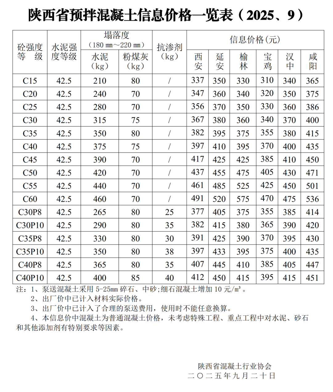 陕西省预拌混凝土信息价格一览表(2025、9)
